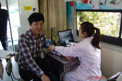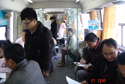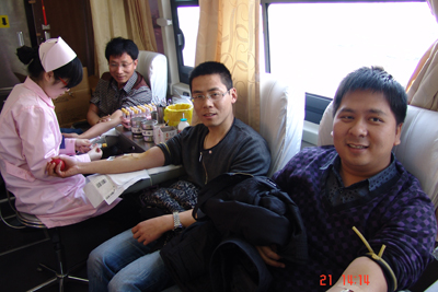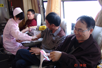 已经是第5次义务献血的共产党员、项目总监郑国健第一个高高挽起衣袖,以轻松的表情完成填表、体检、验血、献血过程,他的自信和勇敢感染了在场的同志,本来略显紧张的气氛一下子变得轻松起来,大家谈笑风生地排队填表、验血、抽血,一边为自己能对社会做一点力所能及的事感到满足和自豪;同时也用说笑的心情冲谈由于采血过程中产生的些许紧张心理。通过身体检查合格的同志是个个兴奋不已,而身体检查暂时不合格的同志,很是有些失落感,特别是从孝顺工地赶过来的夏令同志,感觉白跑了一趟,很是可惜,但大家都赶紧安慰他:“回去好好锻炼,下次还是有机会的。” 值得一提的是,看到献血车停在公司门口,试验所在罗季英总工的带头下也有三位同志加入了献血行列。
