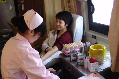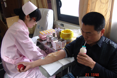 整个献血现场紧张而有序,所有的工作步骤都在有条不紊地进行着。前台的工作人员耐心地向每个献血的人介绍整个流程,填表、解答、引导、体检;后台抽血工作人员为大家准备了牛奶,用风趣的言语缓解部分人的紧张情绪;而其他的工作人员在处理现场紧急状况时发挥了重要的作用,当个别献血者出现晕血、晕针、过度紧张等症状时,是他们配合着医务工作者们及时送上了热水和糖果并用语言安慰他们,使出现不适症状的献血者即刻得到了细致的照料,很快恢复了正常;登记处的工作人员为已献血的人颁发献血证和献血纪念品,在每一张证件和每一份纪念品的背后,是一颗爱心的真诚付出。