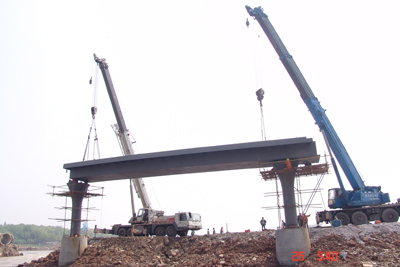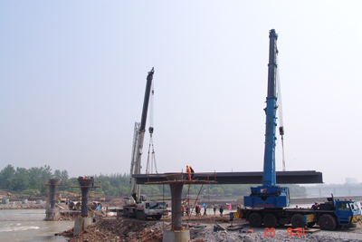 据燕尾洲景观公园工程致远监理部张福明介绍,本计划定于4月25日一次性连续起吊义乌江截流段上三段桥梁的,由于4月24日上游突涨大水,冲垮了义乌江截流段堤坝,只好改由两边分段起吊。根据金华历年汛期情况,燕尾洲景观公园工程指挥部要求在5月15日前将义乌江和武义江上的桥梁安放完毕,保证汛期通水。