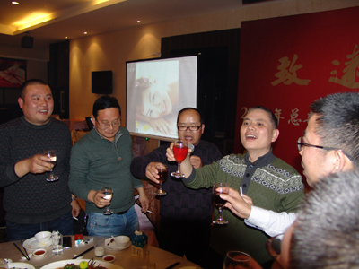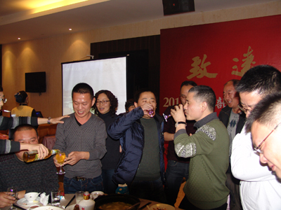 年会在主持人“蛇奔前程去,马携好运来。……”的祝词中拉开了帷幕,接着公司总经理赵肖春作了讲话:2013年是一个丰收年,在此对大家一年的辛苦劳作表示感谢,并希望再接再厉,来年创造更加辉煌的业绩。随后,赵总举杯向大家敬酒:希望大家开怀畅饮,把一年的辛苦抛掉,振作精神,迎接新的挑战。