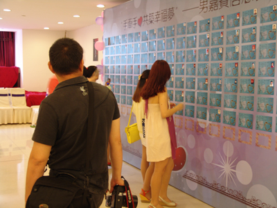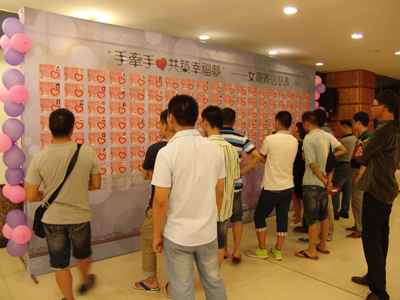 走进活动大厅,舞台布置成一个T台,两边摆放着30来张圆桌,特别显眼的是舞台的正对面布置有一面相亲墙,上面分别有男女嘉宾的信息表,有的还贴上自己的照片,每人的情况一目了然。