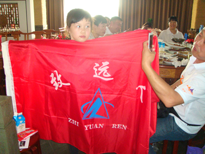 小姑娘自豪地展示公司“致远人”毅行旗帜