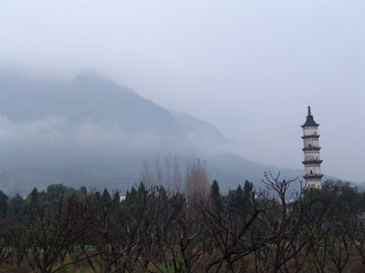 大巴上高速,至建德下高速,穿过山间弯曲的公路,约行2小时多在半圆形山体环围的山脚下,远远就望见一高高的白塔,在雨后的青廓下显得特别醒眼,有人说这就是湖南卫视《爸爸去哪儿了》节目曾经的拍摄地新叶村,整车的人一下子兴奋了起来,惊喜和赞叹声瞬间充满着整个车厢。
