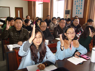 活动把所有参加人员按照循环报数分成六个团队,以PK、竞争的方式进行。首先,每个团队选出一个团长和政委,确定团队名称,并对竞争结果作出承诺。然后,唐朝营老师在授课的同时,提出问题,由各团队员抢答,按各团队人员回答问题的准确度给予相应团队适当的分数,并累加各团队所得的分数,作为各团队竞争的总分数。第一团队承诺不拿冠军团长“剃光头”、第二团队承诺不拿冠军团长“跑会场五十圈”、第三团队承诺不拿冠军团长“跑会场二十圈”、第四团队承诺不拿冠军团长“上下蹲五十个”、第五团队承诺不拿冠军团长“跑会场六十圈”、第六团队承诺不拿冠军团长“跑会场五十圈”。俗话说,有压力就有动力,此话真实不虚。在作出上述承诺后,各团队员都自感压力不小,在抢答问题的时候,举手个个奋勇当先,唯恐落他人之后,抢答场面一度火爆。第一时段,一团小步领先;第二时段,六团领先。“在竞争面前,压力越大,动力越大。”此话此时在这里得到了最佳诠释,作为六个团队中唯一承诺要求“剃光头”的第一团队,在第三时段的竞赛中,爆发出了超常的能量,以遥遥领先的总分数问鼎了“执行力内训冠军”奖杯。而作为其它五个团队团长,此时也“愿赌服输”,该蹲的蹲,该跑的跑。在他们的带领下,后来陆续有人加入了奔跑的队伍,最后竟汇成了全体人员奔跑的洪流,充分体现了我们致远人在竞争环境下的勇气、责任、担当和团结奋发的有为精神。