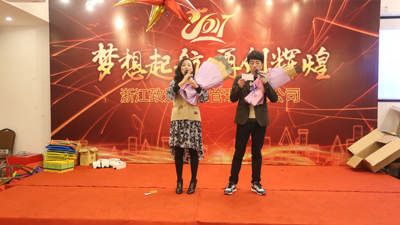 年会在主持人的新年祝福中拉开序幕,随后,公司新的领导团队集体亮相,卢一奇总经理代表新领导团队作了表态,将众志成城,共创“致远”新的辉煌。