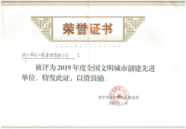致远公司获评全国文明城市创建先进单位荣誉证书