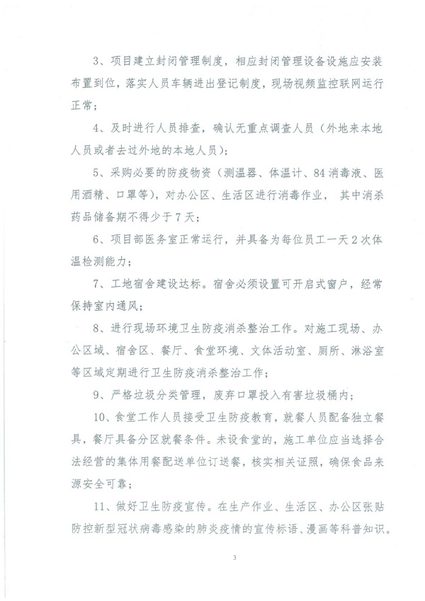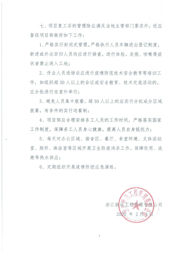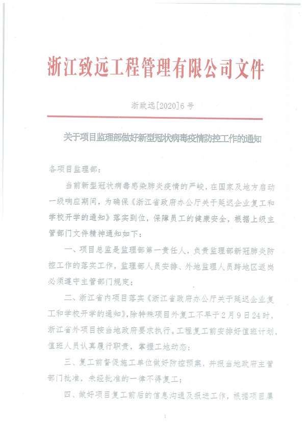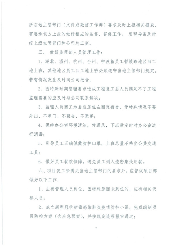 疫情发生后,公司迅速成立疫情防控工作领导小组,及时做好疫情跟踪防控等工作,相继拟定出台了〈新冠肺炎防控返岗返工防护手册》、《复工有关事项通知》、《关于新型冠状病毒防控及复工工作预案》、《关于项目监理部做好新型冠状病毒疫情防控⼯作的通知》、《疫情期间食堂管理规定》,指导员工做好疫情防控工作。公司在做好疫情防控的同时,也积极做好企业复工的各项准备工作,如办公场所消毒、防护用品储备、办公场所的防疫警示宣传、体温检测、食堂就餐管理等。这一系列的防控准备工作为公司及时复工打好了基础条件,经上级主管部门审批,公司总部于2月17日恢复了正常工作。