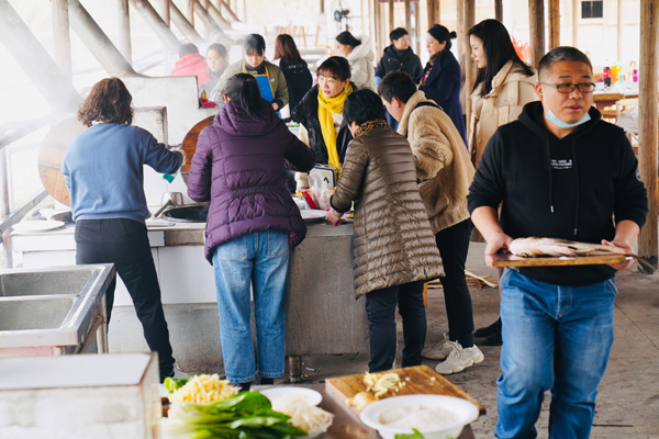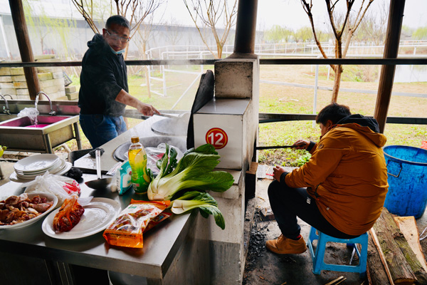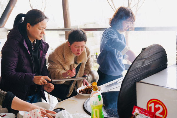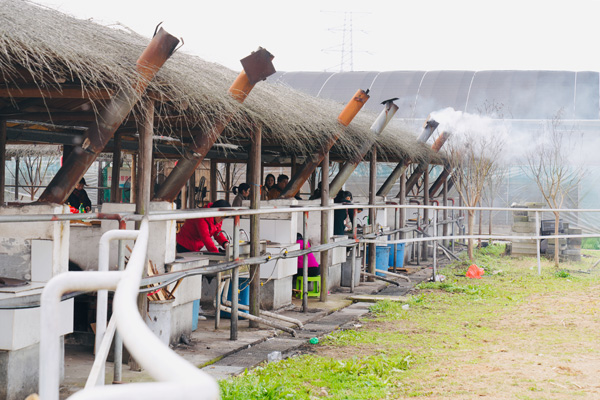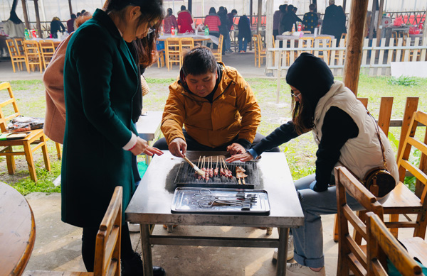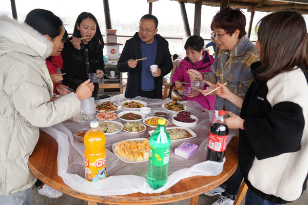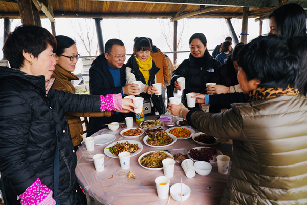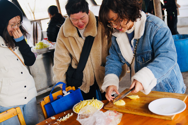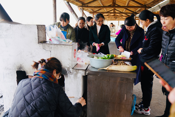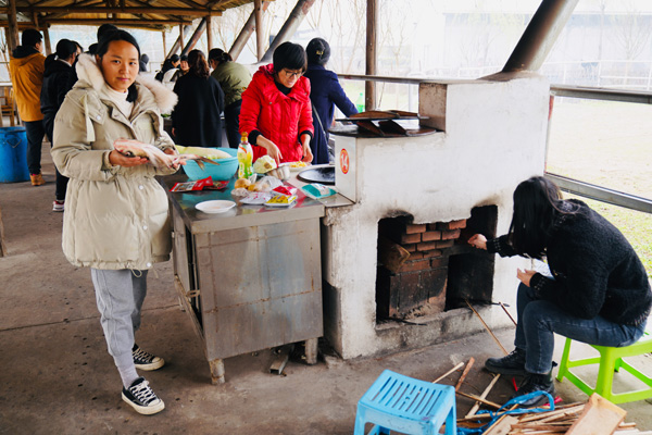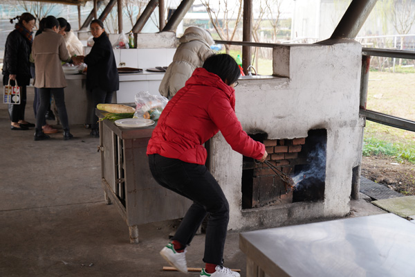 有道是:二月春风似剪刀。在北方的寒流冲击下,农耕文化园土灶区里的风真有点让人吃不消,先前到达的二位服务男生,虽然穿得很厚实,也不时要打个冷颤。但女神们的到来,气氛便一下子活跃了,整个土灶区顿时热闹起来,大家纷纷卷起衣袖,生火的生火、洗刷的洗刷、切菜的切菜、装盘的装盘、抄菜的抄菜、烧烤的烧烤……. 。快乐的女神们早已让土灶区变成温暖的百花园,她们配合协助的叫唤声像春天的百灵鸟,她们忙碌曼妙的身姿像春天里摇曳的花朵,她们在哪里,哪里就是春天。又见炊烟升起,勾起大家回忆,诗情画意,有我有你。
