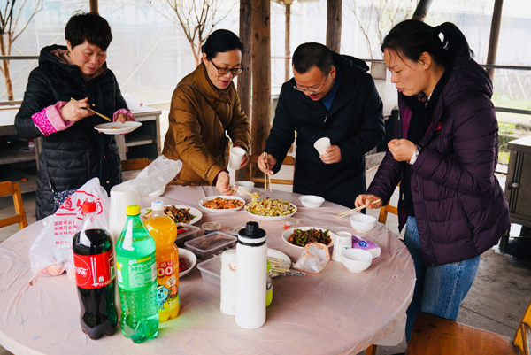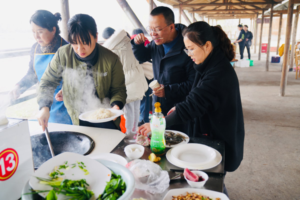 在农耕文化园土灶区里,大家一边干活一边闲话家常,现场其乐融融。不少女职工还露了一手绝活,如切菜如飞的梁大姐、烧菜娴熟的二位陆美女、让人流口水的毛氏红烧肉等等,现场不时发出惊叫声和啧啧的称赞声,先尝为快更是让人快乐无限。不下一个时辰,满满三桌菜就展现在大家眼前。俗话说:来得早不如来的巧。卢一奇总经理百忙之中的探望,正是美味集中出锅的时候,使他首品了多道热气腾腾的出锅菜,真可谓不虚此行了!