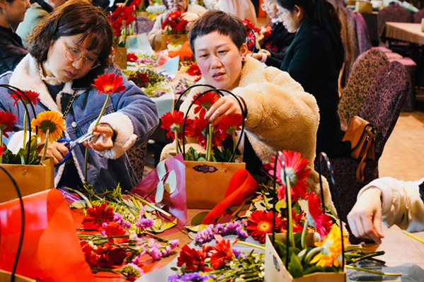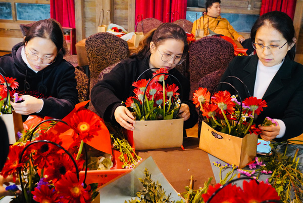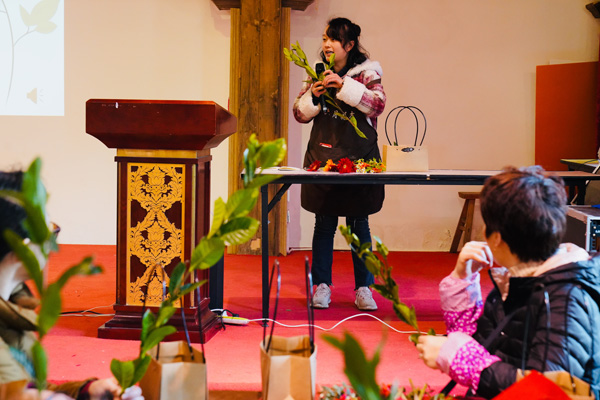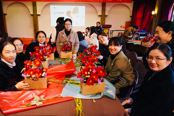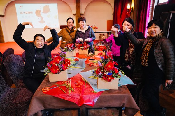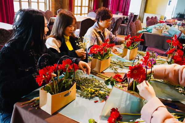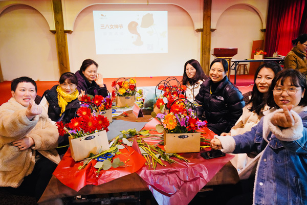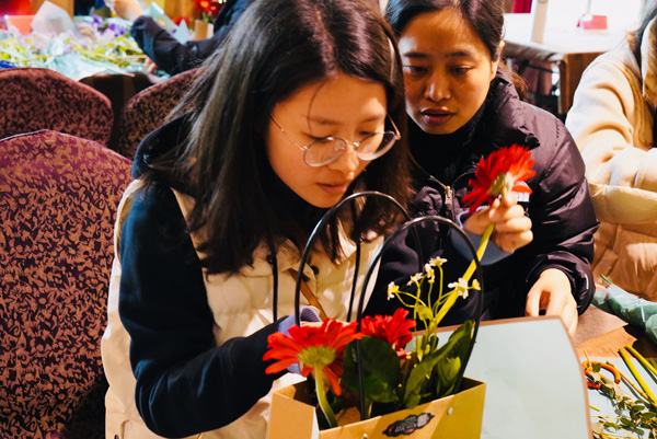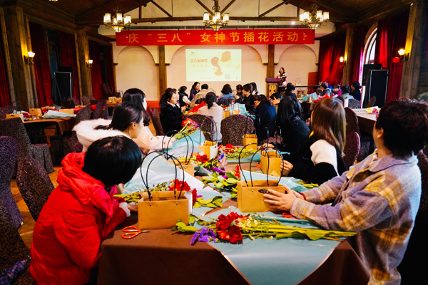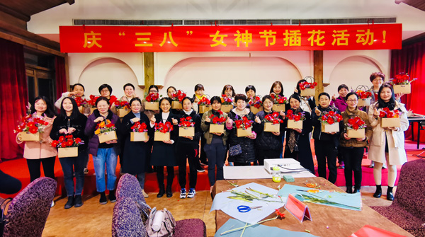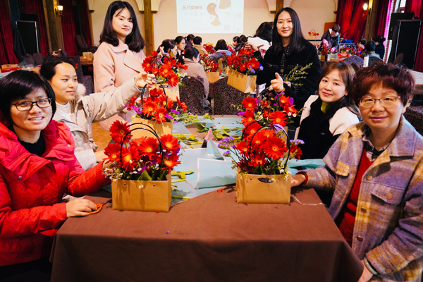 吃过中饭,接下来的是“丝情花意”插花活动,女神们在老师的带领下,就着面前太阳花、小骓菊、勿忘我、枙子叶等材料,发挥着自己的想象,用剪刀修剪形状,插到花篮的合适地方。不多时,一篮篮形态各异、色彩缤纷的花篮出现在人们眼前,也飘来了阵阵花香。看着自己插好的花篮,有的女神们快乐的合不拢嘴。她们带着花篮、带着花香,走向属于自己的春天。