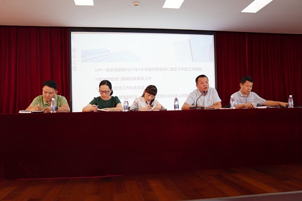 首先,公司总经理卢一奇汇报了今年前三个季度的经营状况及下一阶段的工作部署。他指出,摆在我们面前的任务很艰巨,压力也很大,困难多,但只要大家全力拧成一股绳做事,相信我们的年度目标是一定能完成的。同时要求大家及时做好合同管理、收款、检查、信用评价等方面工作,有问题要及时反映并积极沟通。并对下步工作进行了相应部署:一是公司管理要进行有效转型;二是继续强练内功,不断提升自我素质,特别在总监培训上,我们要引进相应课程;三是加强总监日常管理;四是继续深化绩效考核,尽量用数据来说话。