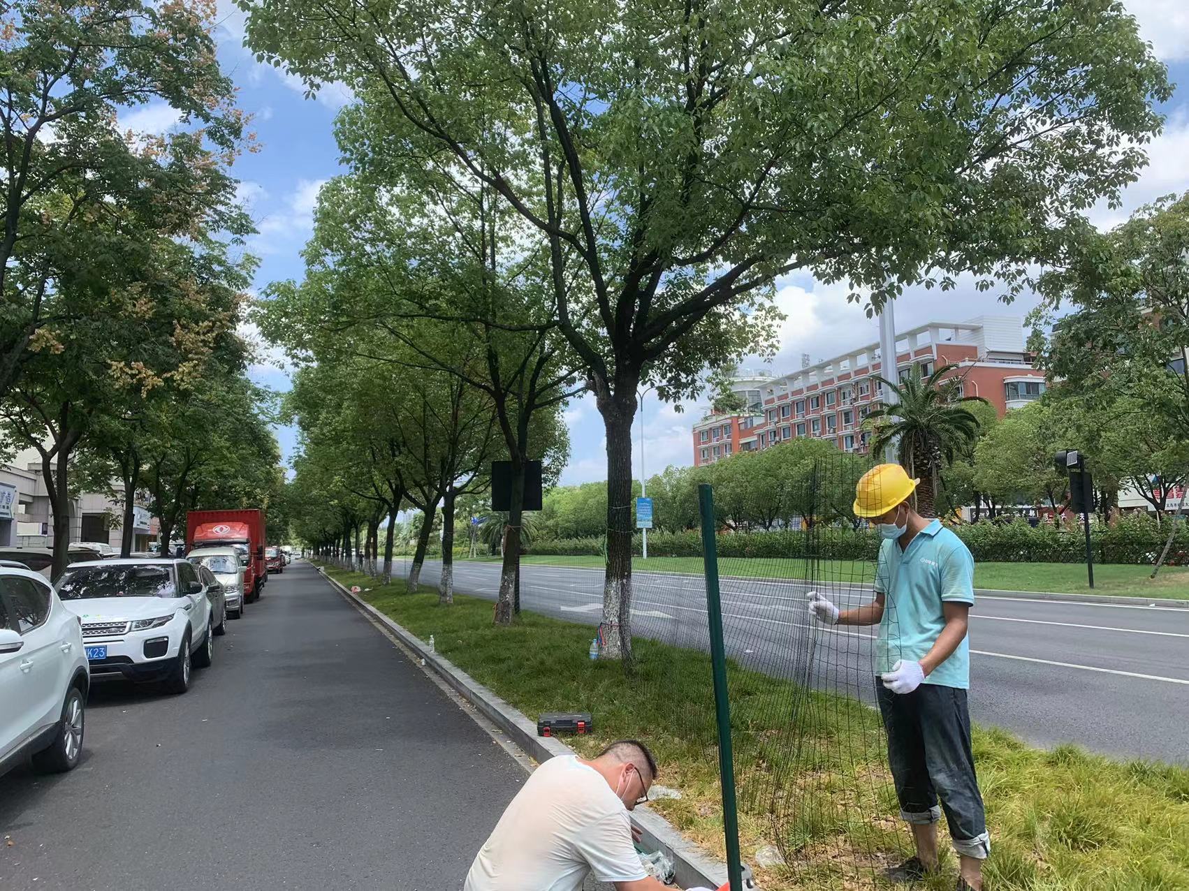总监方俊强、党员吾有祥他们凭着本专业的工作经验,快速分派任务,几人一组进行拉网、立杆、绑扎等流水工序作业进行部署,为了提高效率争取时间,中午就餐大家席地而坐,吃完饭就立马投身工作中。历经8小时奋战,与时间疫情赛跑,终于把约1.5公里周长的下傅小区封控隔离设施搭建任务顺利完成。