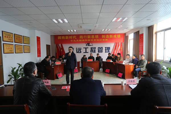 12月26日下午2时,以“拥抱新时代,践行新思想,创造新成绩”为主题的十九大精神和新党章知识竞赛活动在致远公司二楼党员会议室隆重举行,致远支部邀请了局党委委员、局直属机关党委书记、两新组织党委书记徐春来,局直属机关党委专职副书记、两新组织党委副书记吴箐晏前来指导并作为此次竞赛的评委,有50余人参加了此次活动。