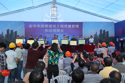 会议首先表彰了金华市建筑业万状骨干企业、建筑业突出贡献企业家。然后,由海天建设集团、歌山建设集团交流先进经验。接着由市住房和城乡建设局局长郭慧强布置全市工程质量工作。最后,由市政府副市长祝伦根讲话。